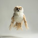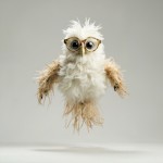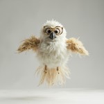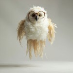 Feathery Owl Puppet with Glasses Floating Against Gray Background