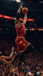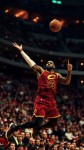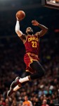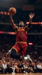 LeBron James Jumping with Ball in Cavaliers Red Uniform, Stadium Background
