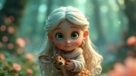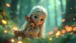 Cute Pixar-style little girl character with long flowing white hair, big expressive green eyes, soft round facial features, slightly enlarged head, wearing cozy pastel clothes, gently holding a tiny fawn, both standing in an enchanted glowing forest, surrounded by magic particles and soft glowing plants, cinematic lighting, dreamy atmosphere, 3D animation, ultra high detail, bright fantastic colors