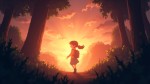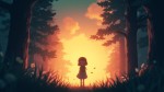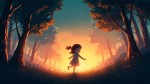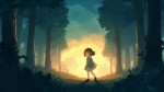 Girl Walking in Forest at Dawn Listening to Song, Animation Style