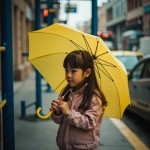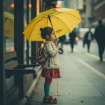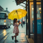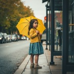 Little Girl Standing with Yellow Umbrella at Bus Stop