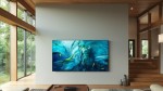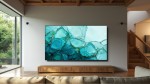 Living Room with Wall-Mounted TV Displaying Abstract Digital Art, Wooden Interiors and Scenic View
