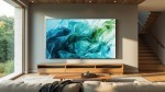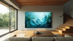 A 120-inch wall-mounted TV is hung in the center of the open living room. The visual center is focused on the TV. The screen is an abstract digital art piece of clothes, featuring blue water and green plants, creating a stunning visual effect. In front of it is a beige fabric sofa, a wooden coffee table, light gray walls, wooden floors, and a wooden ceiling. One side features a full-scene floor-to-ceiling window, with a green natural landscape outside. A wooden staircase leads upstairs, offering ultra-high definition, super details, 8k resolution, and CG rendering