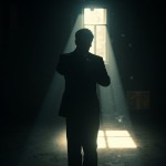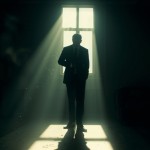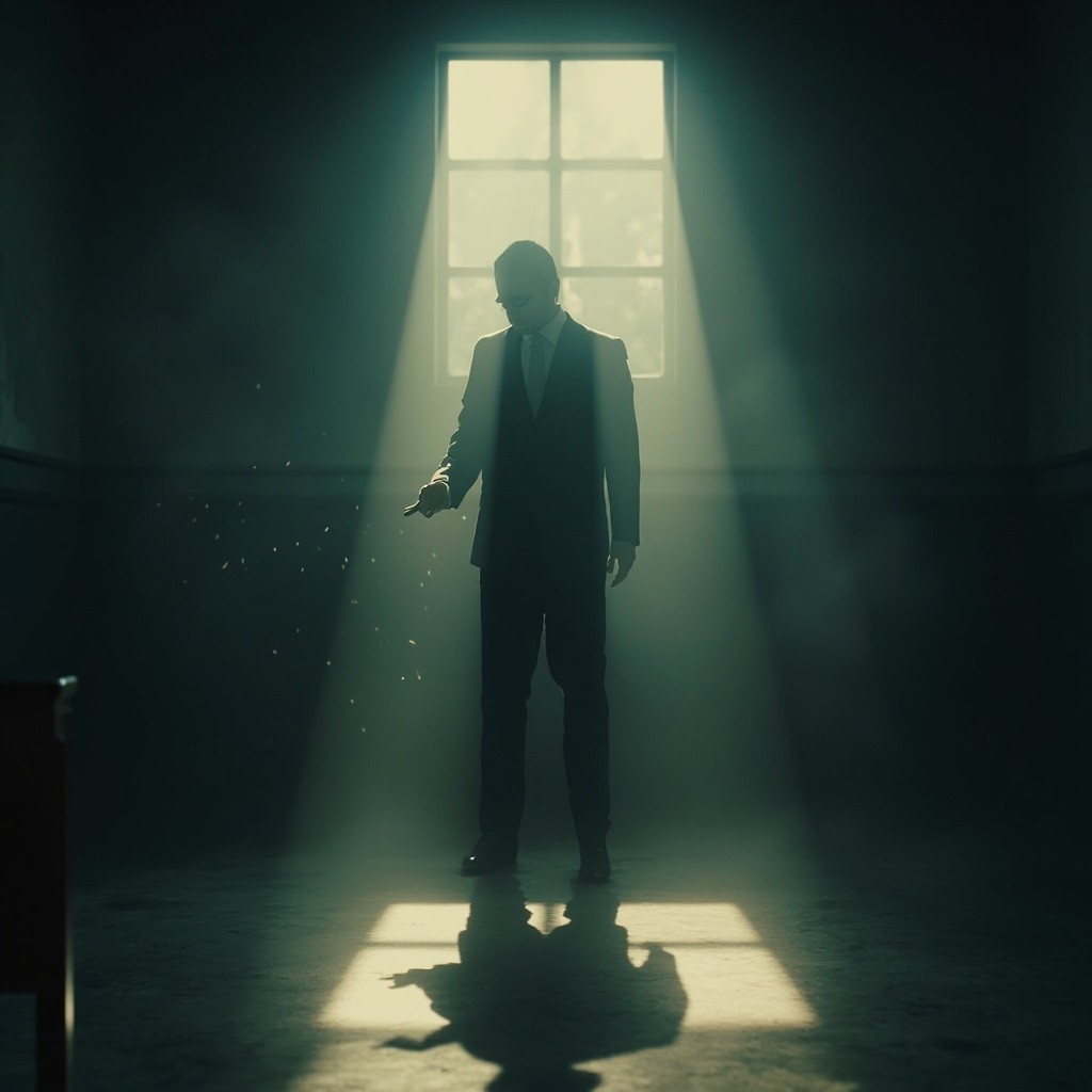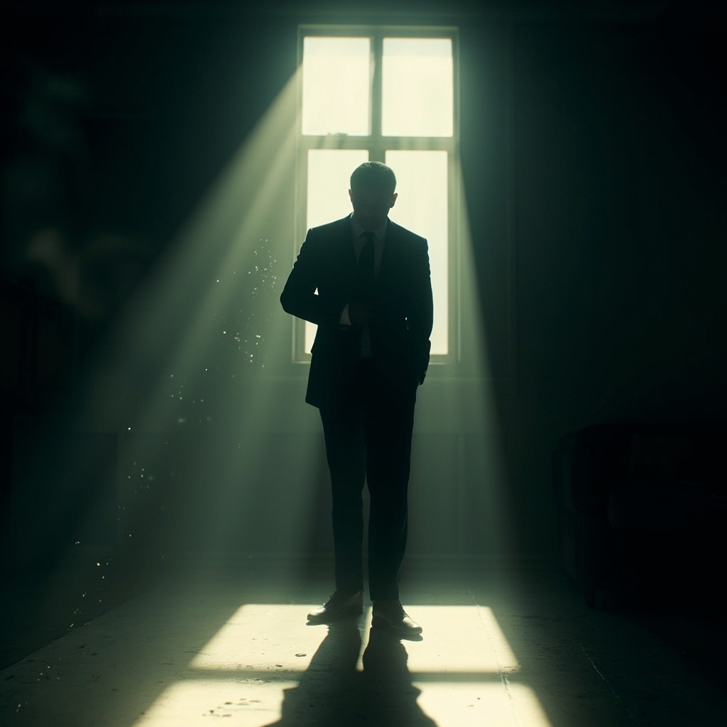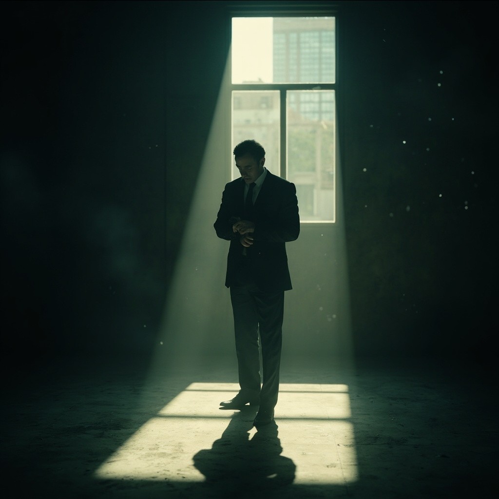 A cinematic, ultra-realistic scene inside a dimly lit single room. A lone person stands in the center, seen from behind and slightly side angle so the face is completely hidden. Soft light from a window casts long dramatic shadows across the floor. The person is wearing a formal suit, adjusting their sleeve slowly, showing confidence and quiet pain. Dust particles float in the air, glowing in the light beam. Moody atmosphere, emotional depth, shallow depth of field, film grain, soft cinematic lighting, 4K, photorealistic, dramatic composition, Netflix-style cinematography