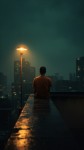 A wide rooftop scene at night, captured from a distant, still perspective. A lone figure in an orange t-shirt sits quietly at the edge, back turned, arms resting slightly behind him. A dim streetlamp glows beside him, casting a soft amber halo over the cold concrete. The rain continues falling gently, unnoticed. Beyond him, the city's towering buildings loom like silent witnesses, their windows barely lit, fading into the mist. Nothing moves—except time. The figure doesn’t fidget or sigh. He just sits, in acceptance. There is no escape, no protest. The scene feels like the last page of a diary: tired, unresolved, yet strangely peaceful. The mood is quiet resignation — a stitched-together life laid bare in one still moment. The glowing streetlight feels less like hope and more like memory, flickering faintly above a city that never looked back.