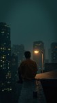 Rooftop Night Scene with Lone Figure Sitting Under Streetlamp