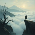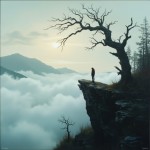 Lone Figure Standing on Cliff Overlooking Cloud Sea and Distant Peaks