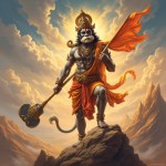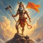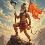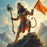 Lord Hanuman Monkey Face Holding Gadha and Orange Flag on Mountain