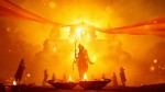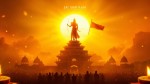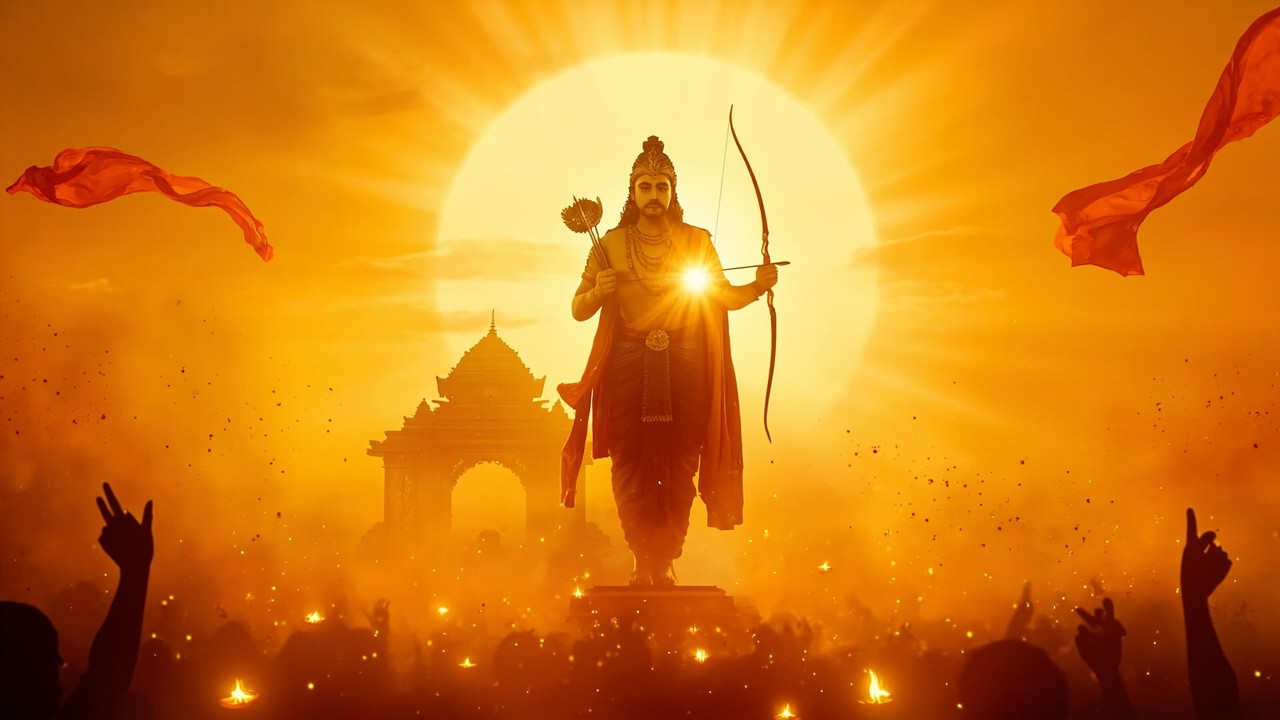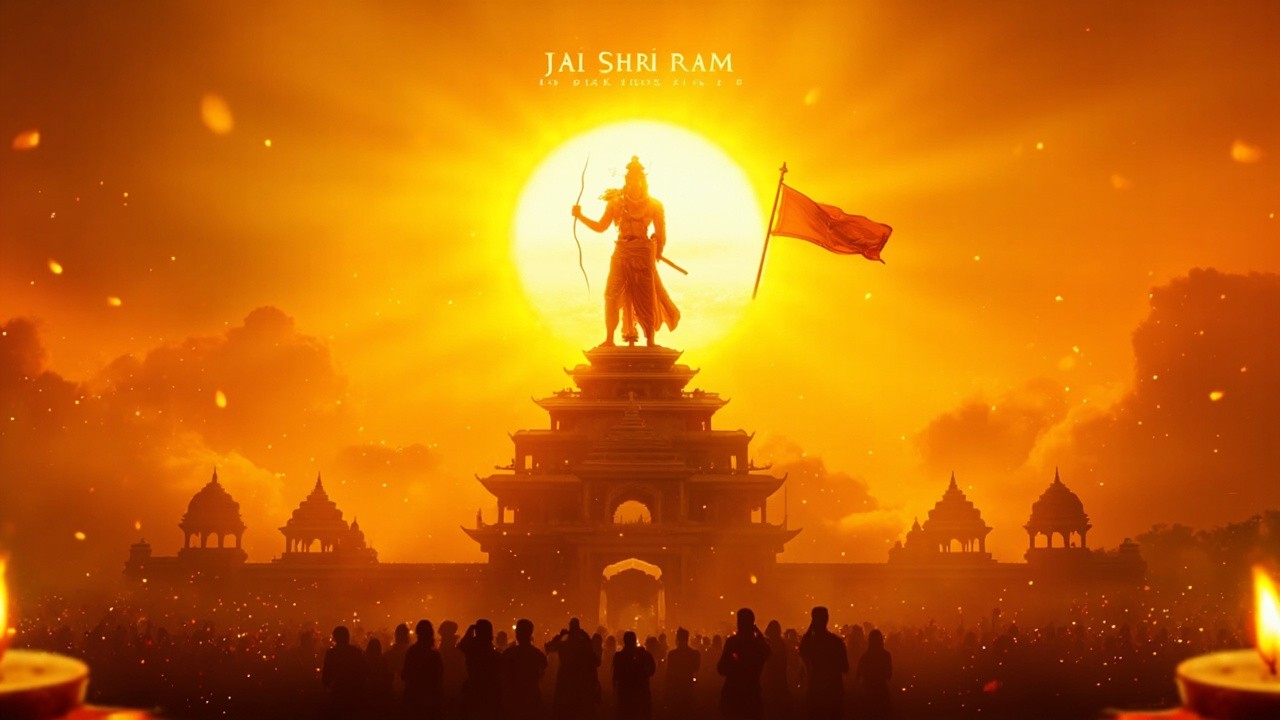 Golden Sunrise Behind Ancient Indian Temple with Lord Rama Silhouette and Devotees