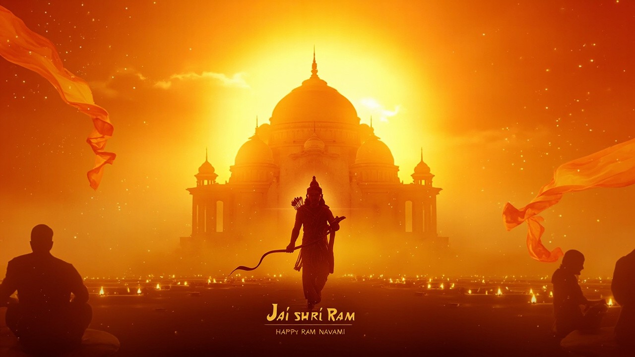 A divine golden sunrise behind an ancient Indian temple, Lord Rama standing gracefully holding a bow (Kodanda), glowing aura around him, saffron flags waving in the air, soft light rays, floating particles, diya lamps at the bottom, silhouettes of devotees with folded hands, festive spiritual atmosphere, rich golden and saffron color palette, high contrast, minimal yet powerful composition, clean space for text Text on Image: “Jai Shri Ram” “Happy Ram Navami” Style: Ultra HD, cinematic lighting, semi-realistic + vector blend, sharp edges for LED visibility, uncluttered, centered composition Aspect Ratio: 16:9 (landscape, LED screen friendly)