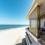 une maison architecturale de luxe en bordure plage avec un ciel bleu et une mer calme avec un bord de plage au sable blanc. La maison est vue de moitié est magnifiquement ornée d'une façade découpée au laser dont le motif laisse passé la lumière. il n'y a pas de soleil ni d'oiseaux dans le ciel. la maison a des couleurs blanche, beige, marron et un peu de noir, la découpe laser est un metal dorée très clair, mais pas doré. La maison prend 1 tier de l'image