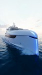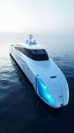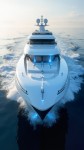 A luxurious concept white yacht designed for private sea deliveries, featuring a sleek and elegant design with blue-toned accents. The vessel glides smoothly over the water at day, illuminated by soft cinematic lighting that reflects off the sea, creating a serene and opulent atmosphere. The exterior is polished to perfection, with modern lines and sophisticated detailing that cater to high-end clientele. The yacht is equipped with state-of-the-art features for delivering exclusive goods or services directly to luxury yachts in the open sea, offering an unparalleled experience of convenience and luxury, the sea and the sky is in white ambiant