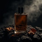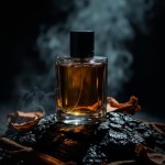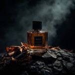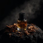 Luxury Men's Perfume Bottle on Volcanic Rock with Cinnamon Sticks and Tobacco Leaves