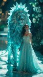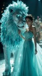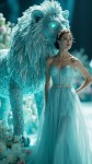 A majestic lion formed from shimmering aquamarine crystals with crystalline texture, its mane accented with platinum, stands tall with a commanding presence beside a model with a 9-head proportioned figure (180cm tall, long legs, slender waist, and soft curves), wearing a Chanel aqua blue wedding dress with a quilted overlay, pearl-embellished hem, and a flowing train, the model poses confidently under soft spotlight, the lion’s eyes glowing with matte turquoise facets, the animal, standing at 2.7m to 3.6m tall, is 1.5 to 2 times larger than the 1.8m-tall model, dominating the scene as a colossal guardian beside her, on a luxurious runway with blurred floral elements, hyper-detailed fantasy art with cinematic lighting, vibrant colors, shallow depth of field, 9:16 ratio, ultra-realistic textures, glowing gemstone effects.