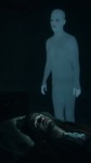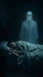Man Sleeping with Ghostly Figure Standing Beside in Dark Room