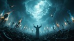 "The man in the white thawb stands in the valley of bones, his arms raised to the bleeding sky. Above him, the clouds tear open—not with light, but with a sickly phosphorescent glow. From the rift, tormented souls come screaming downward like falling stars, each one a streak of blue-white fire. The bones begin to tremble as the spirits collide with them. Skulls snap upward with jaws unhinged, drinking in the screaming souls. Rib cages rattle as spectral light pours between the bars. The ground itself heaves as skeletal hands claw upward, grasping at the descending spirits like beggars catching rain. But something is wrong. The souls don't settle peacefully into their bones. They thrash. They burn. The skeletons don't stand—they convulse, jerking like marionettes with tangled strings. Their eye sockets blaze with unnatural fire, casting jagged shadows across the ruins. The man staggers back as the reanimated dead turn toward him—not with gratitude, but with the furious hunger of souls forced back into rotting flesh against their will. The last spirit falls—not into bones, but into the man's open mouth. His white thawb ignites with the same ghostly fire as he drops to his knees, screaming in a chorus of stolen voices. Final shot: The bone-field stands motionless once more. The man's smoldering thawb lies empty in the dirt. And high above, the rift in the sky begins—slowly, terribly—to widen."