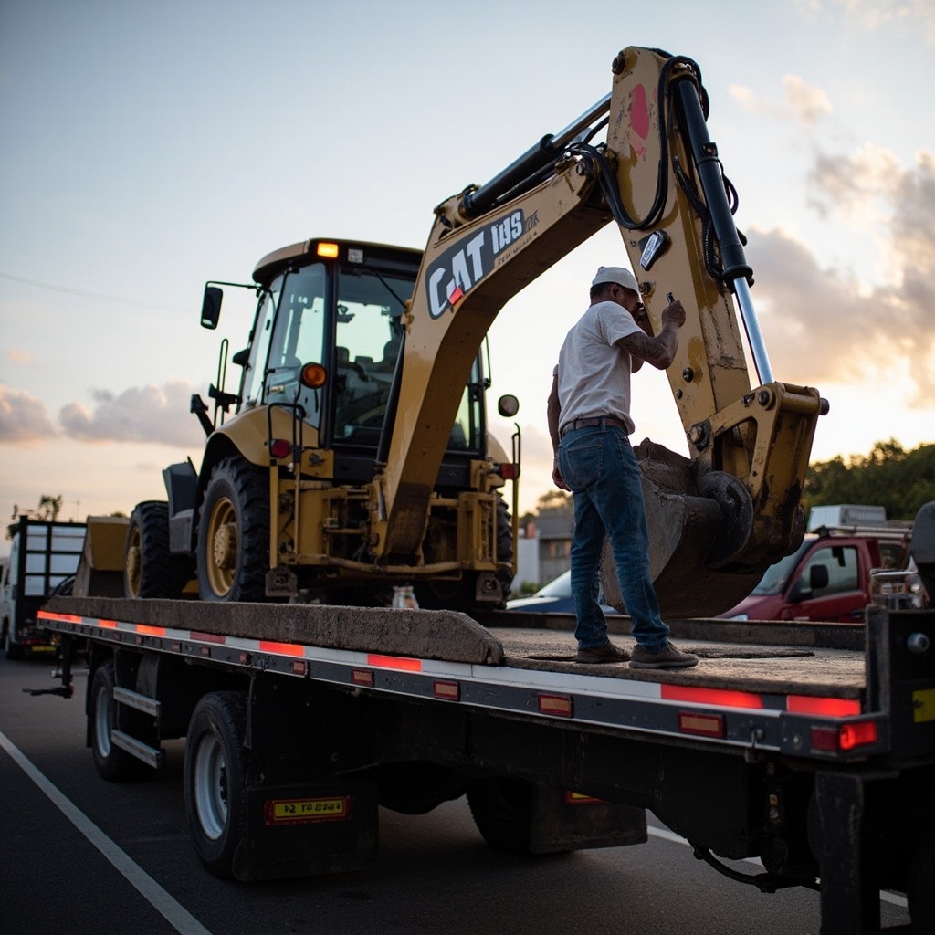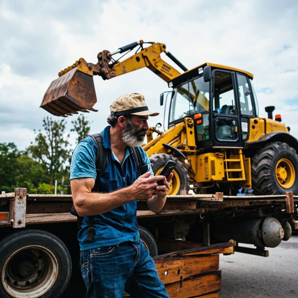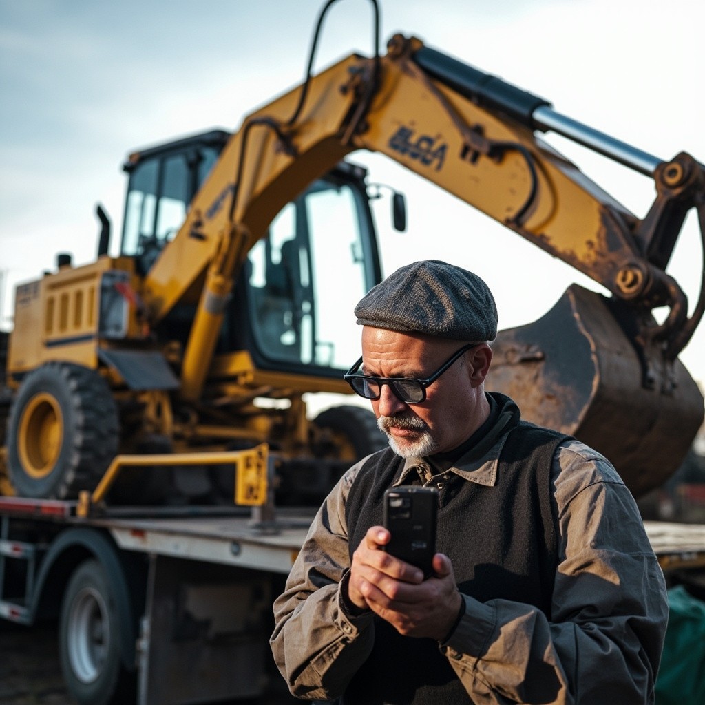 Man Checking Mobile Phone Next to Backhoe Digger on Lorry