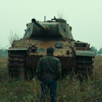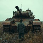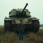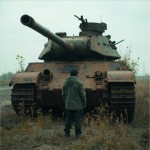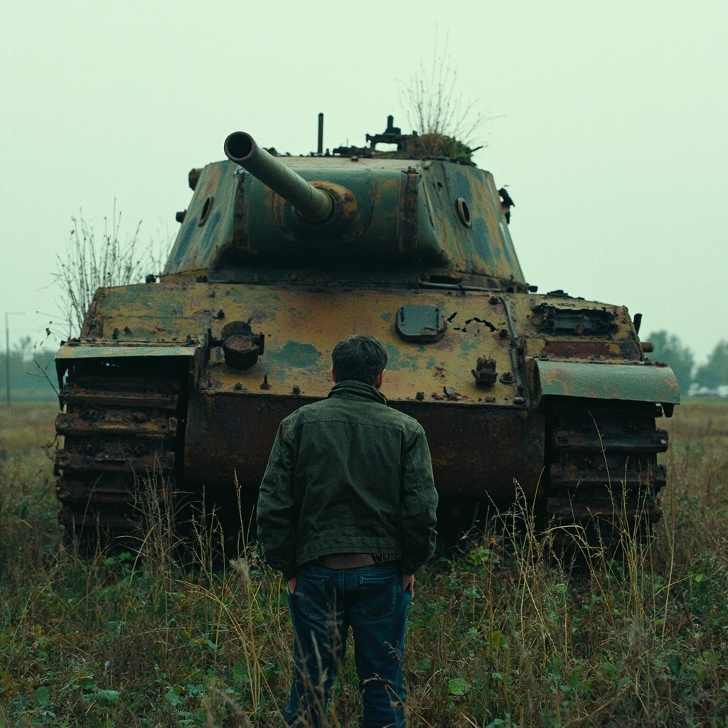 Horizontal 16:9 widescreen format. No subtitles, no captions, no text overlays of any kind on screen. A ordinary person standing with their back to the camera, contemplating a massive abandoned and rusted war tank in front of them. The tank is completely out of service — heavily corroded, covered in rust, with broken tracks, cracked armor and wildflowers growing through its gaps. The contrast between the fragile human figure and the once-powerful machine emphasizes the idea of obsolescence and the passage of time. Overcast natural lighting, open field or empty urban outskirts. Cinematic, hyper-realistic, 4K, wide angle, melancholic and reflective atmosphere, photorealistic rendering.