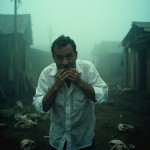 "An ordinary man in a white linen shirt picks his way through the ruins of the village, his clothes unnaturally bright against the decay. The fog curls around him like a living thing, dampening sound—his breath, his footsteps—until the world feels muffled, unreal. Then he sees them: bones. Not arranged, not buried, but scattered like trash. A child’s ribcage. A jawbone, still clenched in a final scream. He staggers back, hands flying to his mouth. The white fabric of his sleeve stains gray where it brushes the dirt. Around him, the village isn’t just dead—it’s been eaten. Doors splintered inward, walls clawed apart from the outside in. And the silence. No birds. No wind. Just his pulse, hammering louder and louder until— A whisper. Not from the bones. From the fog. Close-up: His head whips toward the sound. The camera catches the exact moment his fear turns to something worse—recognition. Because that voice? He knows it. The shot fractures into grainy, shuddering frames. The bones rattle. His white shirt is the only light left in the world."