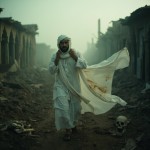 "A man in a flowing white thawb walks alone through the ruins of the village, the pristine fabric billowing like a ghost in the stagnant air. His sandals crunch over something brittle—not twigs, but fingers. The fog thickens as he steps forward, revealing more: a ribcage cracked open, a skull staring up from the dirt with empty sockets. He freezes. His breath catches. The white of his robe suddenly feels too bright, too pure for this place—a blasphemy against the decay. The village isn’t just dead; it’s been defiled. Doors hang broken, not from violence, but from something slithering out. The shadows between collapsed walls seem to breathe. Then— A whisper. Not from the bones. From his own throat. His hands fly to his neck in horror. The voice comes again— his words, but not his voice. Something is speaking through him. The camera lingers on the back of his thawb as he runs—the once-white fabric now smeared with handprints that weren’t there before. Final shot: The robe, discarded in the dust, still moving as if worn by an invisible body."