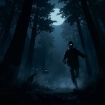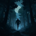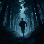 Create a dramatic 2D animation scene of a man running through a dark forest at night. The forest should be dense, with tall trees casting long shadows. Use a cool, moonlit color palette—deep blues, grays, and black silhouettes. The man should look anxious or fearful, constantly looking back as if being chased. His breath should be visible in the cold night air. Animate rustling leaves, snapping branches, and flickering shadows as he moves. Add subtle movements in the background—glowing eyes between trees, or shifting shadows—to increase tension. The animation style should be cinematic and moody, like a psychological thriller. Frame in 16:9 or 9:16 depending on platform."