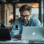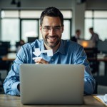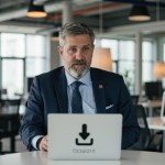 Man Sitting at Desk with Laptop and Download Arrow Symbol, Modern Office Background