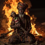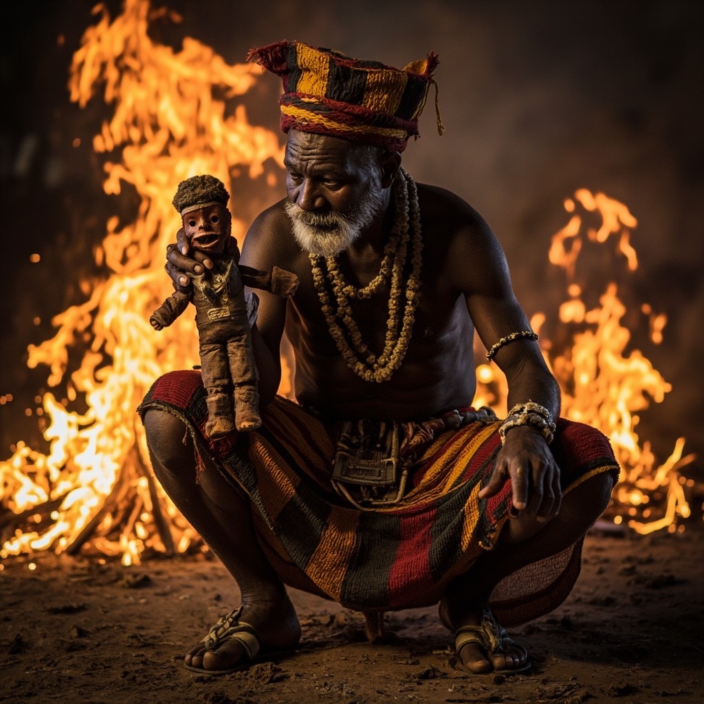 50-Year-Old Man in Nigerian Attire Holding Voodoo Doll Near Fire
