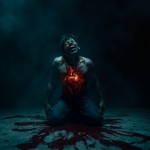 Man in Agony with Heart Exposed in Dark Bluish Scene