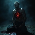 "A hyper-realistic dark and dramatic scene of a man in agony, kneeling with his chest torn open, his heart emerging from his body, covered in blood. The background is shadowy and dimly lit, with cold, bluish tones. His face is twisted in pain and despair, blood dripping from the wound and splattered around him. The heart appears vivid and raw, slightly glowing in the darkness, as if symbolizing intense emotional or physical suffering."