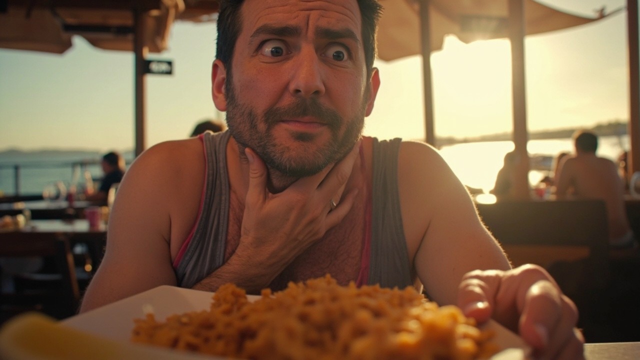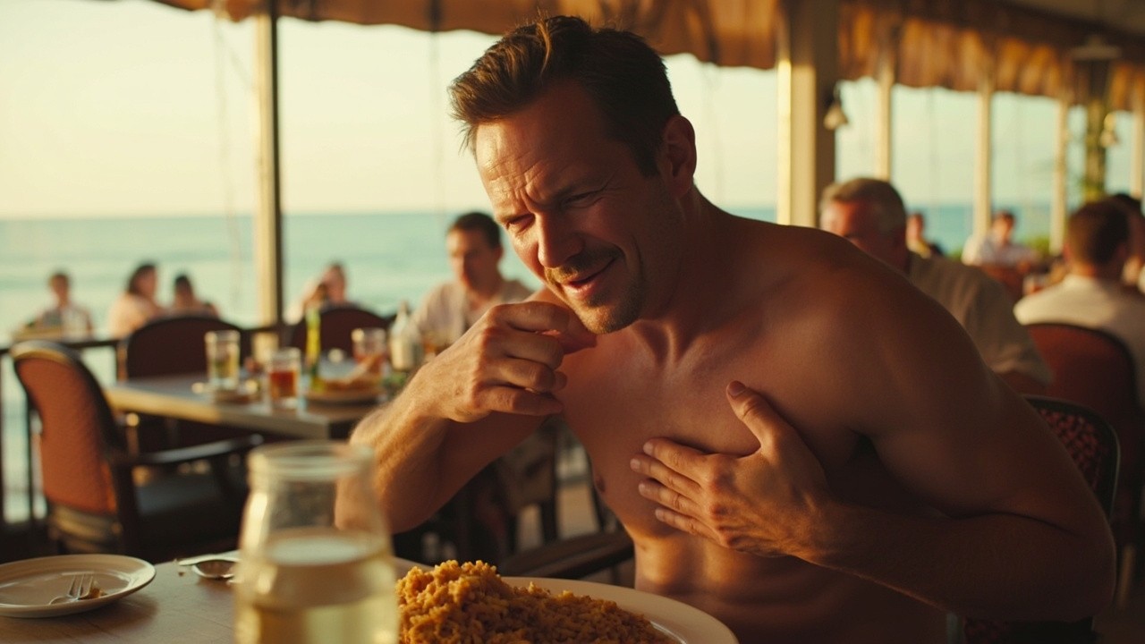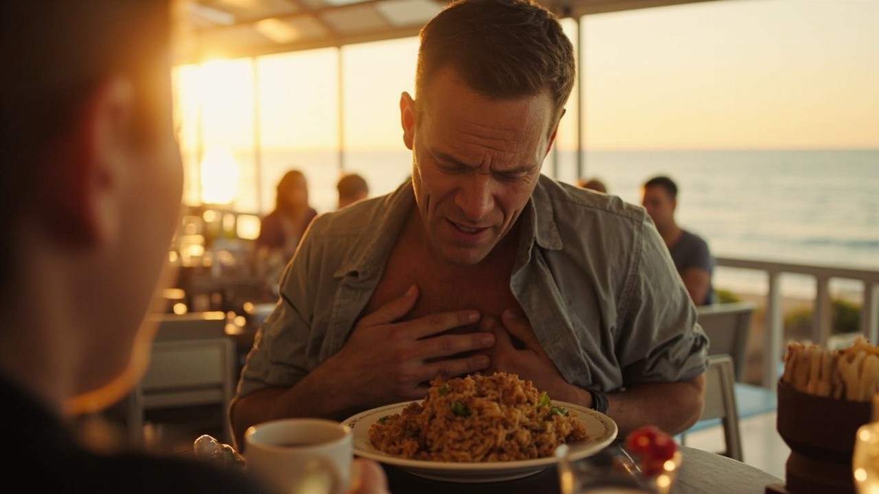 Man Enjoying Fried Rice at Seaside Restaurant Experiencing Heartburn
