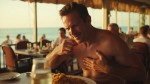 A man is enjoying a plate of fried rice at a seaside restaurant with warm lighting, around 4:00 PM. Suddenly, he experiences severe heartburn and acid reflux, clutching his chest with a tormented expression for about 15 seconds. After this period, his face brightens, showing relief and a refreshed, comfortable demeanor, as the burning sensation subsides.