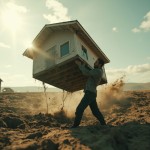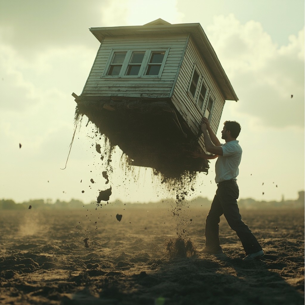 A hyper-realistic cinematic video created from my uploaded photo as the base. The same house visible in the photo remains in its original place. The subject from the photo stands beside the house. The ground shakes gently as cracks spread outward and loose soil breaks apart. With natural, realistic body motion and subtle breathing, the subject grips the base of the house with both hands and slowly lifts it from the ground. Dust and small debris fall as the house comes free, foundation and soil pieces dangling. The subject raises the house above shoulder height and begins walking forward while carrying it. Smooth physics-accurate movement, natural hair and cloth motion, soft sunlight rays, real-world shadows, and cinematic depth of field, 4K hyper-real live-action realism, no exaggerated expressions.