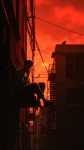 A cinematic digital painting of an urban alley at sunset. The sky is vivid orange and red, casting a warm glow. A man aged 25-30 sits alone on a concrete platform attached to an old apartment building. He wears casual clothes — a t-shirt and rolled-up pants — and is smoking a cigarette, the smoke faintly curling into the air. His posture is thoughtful, melancholic. In the distance, on the rooftop of a nearby building, a black cat sits, silhouetted against the sky. The buildings are slightly weathered, with peeling paint and metal staircases. Power lines crisscross the sky, enhancing the quiet, moody city atmosphere. The lighting highlights the contrast between warm sunset tones and the cooler shadows in the alley. Anime-inspired style, with high attention to detail