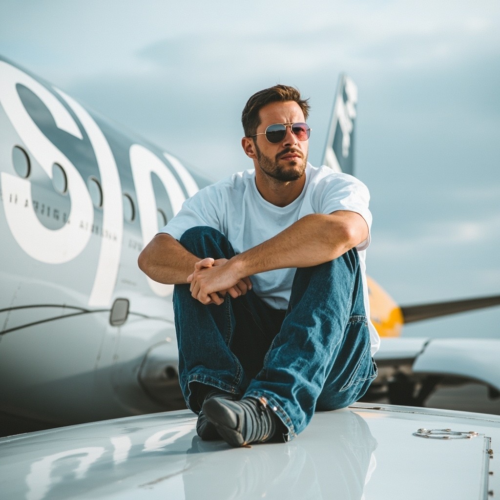 Caucasian Man Sitting on Spirit Airlines Airplane Wing