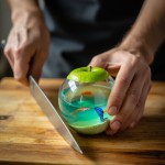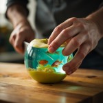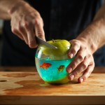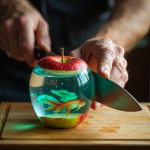 Man's Arm Cutting Transparent Apple with Turquoise Water and Colorful Fish on Wooden Board