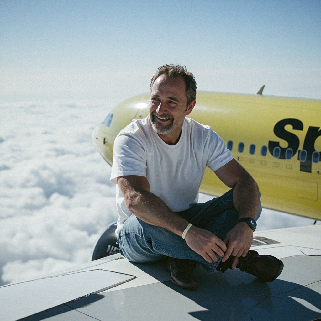 A man, caucasian descent, a white tee and blue jeans, sitting with his arms around his tucked in knees on the left wing of an airplane marked with "Spirit Airlines" on the side of the airliner. the camera is looking at him from the tip of the same wing he is sitting on. The camera zoomed out a bit allowing us to see at least 1/3rd of the plane. The plane is also in the air, with some clouds under the plane. the man is also smiling and the camera is zoomed out far enough for us to see the top of the plane.