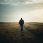 Man Walking Alone on Dirt Path in Expansive Field, Slightly Cloudy Sky