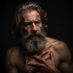 Man with Gray Beard Tearing Heart Out, Long Straight Hair, Pain, Wrinkles, Scar