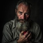 Man with Gray Beard Tearing Heart, Long Straight Hair, Pain, Wrinkles, Scar, Hope