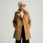 Women Over 40 with Short Hair, Tan Trench Coat and Black Trousers, Wearing Glasses