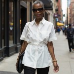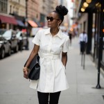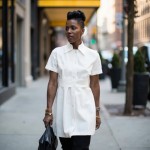 Create a light skinned black woman who is over 40 with short hair pulled into a chignon. She is wearing a Norma Kamali Women's WHITE Button front Neck Shirt Flared short sleeve Mini Dress with a self sash at waist that ends 6" above her knee. She is wearing a dress over slim black capri pants and tan ballet flats with a black cap toe, and she is carrying a large clutch bag in black. She is wearing gold bangle and earrings. she is in a city setting.