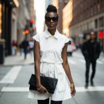 Middle-Aged Black Woman in White Mini Dress and Black Capris in City