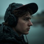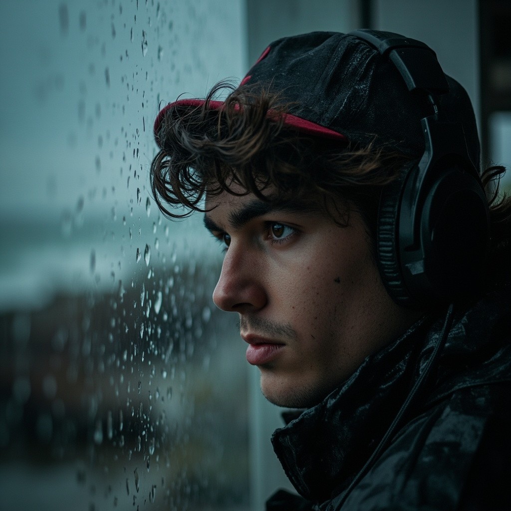 Close-up portrait of a young 21 year old boy(attached photo) in the rain, seen from profile, looking into the distance with a melancholic expression. he is wearing a dark baseball cap with a red detail and black over-ear headphones.His heavy dark hair is tousled by the coastal wind, falling leicht ins Gesicht, voller Textur und Bewegung.. Raindrops are clearly visible on his skin.The background is a heavily blurred, dark, rainy outdoor scene with visible streaks of falling rain.