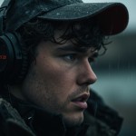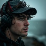 Young Man in Rain with Melancholic Expression, Baseball Cap, and Headphones