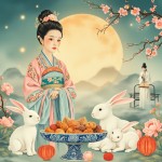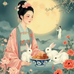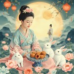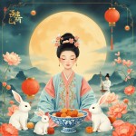 Mid-Autumn Festival Illustration with Han Woman, Rabbits, Moon, and Chinese Lanterns