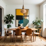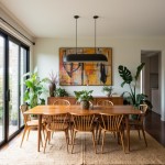 Mid-Century Modern Dining Room with Abstract Wall Art and Indoor Plants