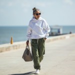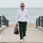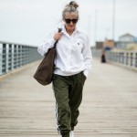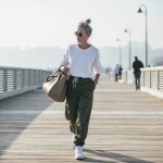 Over 40 Year Old Influencer with Gray Hair Walking on Boardwalk