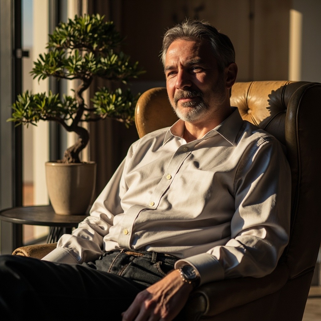 male psychologist in his mid-40s sitting in a relaxed pose in a comfortable armchair. Calm, confident, and trustworthy expression with a gentle, subtle smile. He wears a light, slightly loose shirt and dark jeans. Beside him, on a small coffee table, stands a prominent bonsai tree. Short hair frames his face. The setting features warm natural light, a cozy modern interior with wooden textures and soft neutral tones. Realistic portrait photography, eye-level camera angle, shallow depth of field, 85mm lens, cinematic soft lighting.