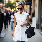 use this garment from Amazon:Norma Kamali Women's Super Sleeveless Button front Neck Shirt Flared Mini Dress in white poplin with self sash and short cap wide sleeves to cover bicep. Dress ends at 6" above knee. Hem is even. Show it on a 40-year-old woman with with a messy pony tail. Her hair is grey. she is wearing this dress with denim fitted flared jeans and high heel black sandals. she is in a city setting and is carrying an Italian black leather woven bag with hands.