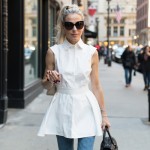 40-Year-Old Woman in White Poplin Mini Dress and Denim Flared Jeans in City